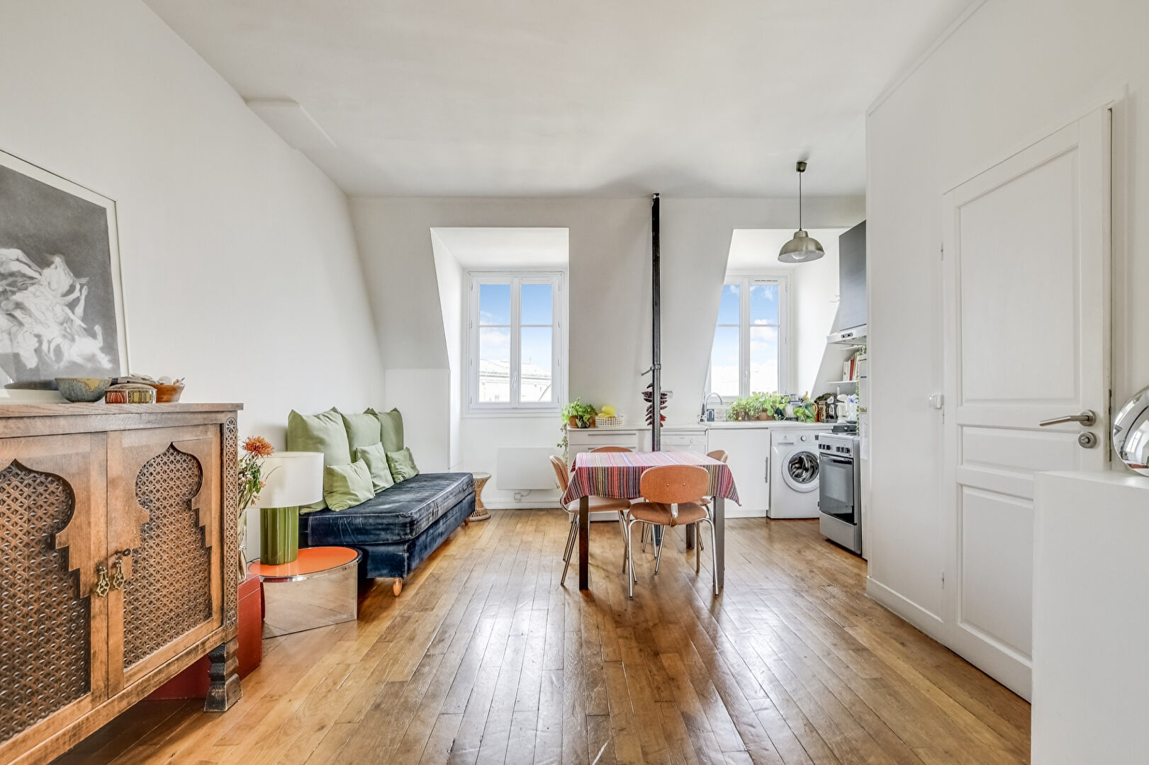 Il se compose d’une entrée, d’un premier séjour côté rue exposé Nord-Ouest, sans vis-à-vis, avec vue dégagée sur l’Eglise Saint-Vincent-de-Paul, d’une cuisine ouverte équipée et aménagée, d’un second séjour très lumineux côté cour intérieure exposé Sud-Est, d’une chambre calme sur cour également, ainsi que d’une salle d’eau avec WC.